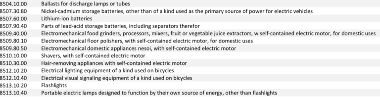 The new list includes “Ballasts for discharge lamps or tubes”, “Electrical lighting equipment of a kind used on bicycles”, and “flashlights”.