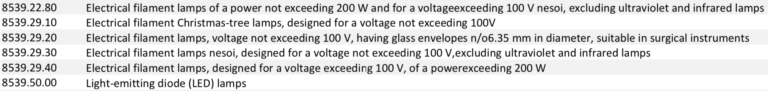 Other new items on the new tariff list include “Electrical filament lamps of a power not exceeding 200 W and for a voltage exceeding 100 V nesoi, excluding ultraviolet and infrared lamps”, “Electrical filament lamps, voltage not exceeding 100 V, having glass envelopes n/o6.35 mm in diameter, suitable in surgical instruments”, “Electrical filament lamps nesoi, designed for a voltage not exceeding 100 V,excluding ultraviolet and infrared lamps”, and “Light-emitting diode (LED) lamps”.